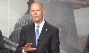 Sen. Rick Scott (R-Fla.) and other Republican senators hold a press conference at 2:00 p.m. ET on May 3 to discuss the Democrats’ failure to negotiate with Republicans on the debt ceiling.